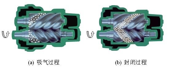 螺桿式空氣壓縮機(jī)的工作原理:電機(jī)驅(qū)動(dòng)轉(zhuǎn)子,主從轉(zhuǎn)子的齒溝空間在轉(zhuǎn)至進(jìn)氣端壁開(kāi)口時(shí),其空間大,外界的空氣充滿(mǎn)其中,當(dāng)轉(zhuǎn)子的進(jìn)氣側(cè)端面轉(zhuǎn)離了殼之進(jìn)氣口時(shí),在齒溝間的空氣被封閉在主、從轉(zhuǎn)子與機(jī)殼之間,完成吸氣過(guò)程。在吸氣結(jié)束時(shí),主、從轉(zhuǎn)子齒峰與機(jī)殼形成的封閉容積隨著轉(zhuǎn)子角度的變化而減少,并按螺旋狀移動(dòng),此為壓縮過(guò)程。在輸送過(guò)程中,容積不斷減少,氣體不斷被壓縮,壓力提高,溫度升高,同時(shí),因氣壓差而變成霧狀的潤(rùn)滑油被噴入壓縮腔,從而達(dá)到壓縮、降低溫度密封和潤(rùn)滑的作用。當(dāng)轉(zhuǎn)子之封閉齒峰旋轉(zhuǎn)到與機(jī)殼排氣口相遇時(shí),被壓縮的空氣開(kāi)始排放,直到齒峰與齒溝的吻合面移至排氣端面,此時(shí)齒溝空間為零,即完成排氣過(guò)程。與此同時(shí),主從轉(zhuǎn)子的另一對(duì)齒溝已旋轉(zhuǎn)至進(jìn)氣端,形成大空間,開(kāi)始吸氣過(guò)程,由此開(kāi)始一個(gè)新的壓縮循環(huán)。